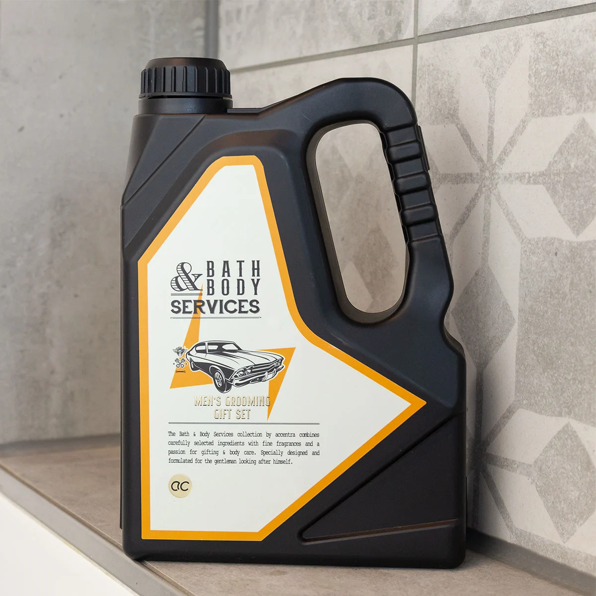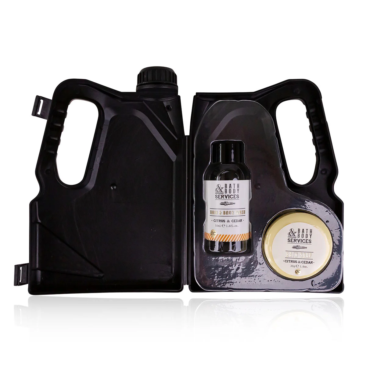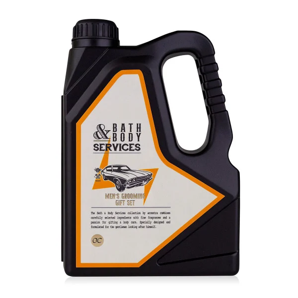 Ένα έξυπνο δώρο για κάθε άντρα που αποτελείται από ένα έξυπνο κουτί σε σχήμα μπουκάλι λαδιού μηχανής που χρησιμεύει σαν αποθηκευτικό κουτάκι και μέσα περιέχει hair & body wash και bath soap , σε φανταστικό άρωμα citrus & cedar.